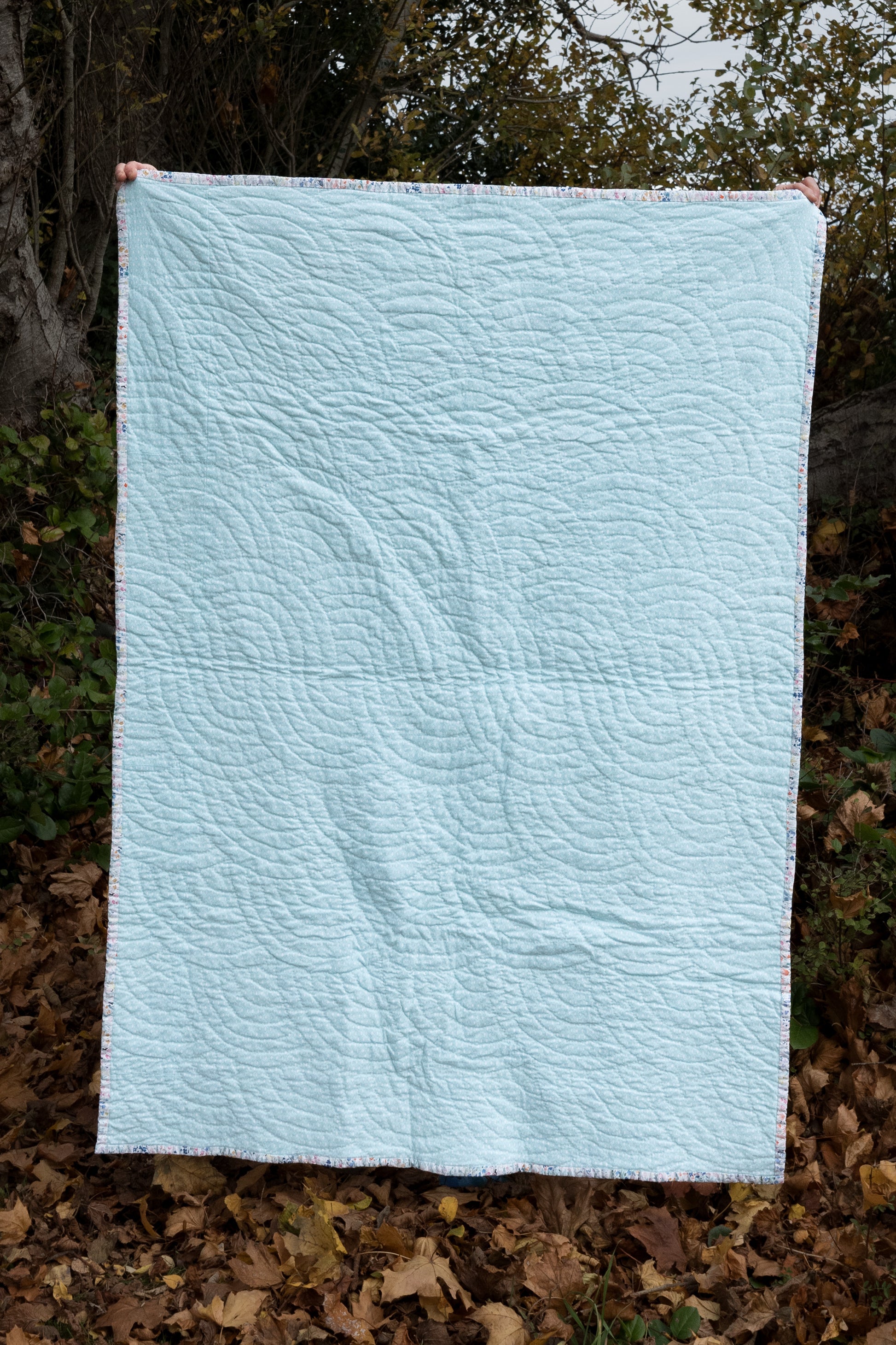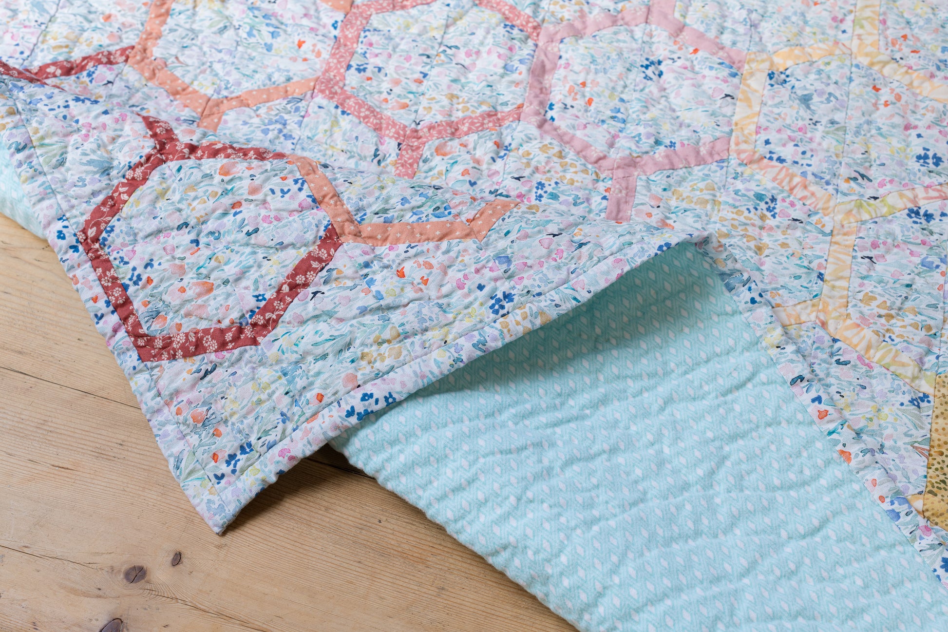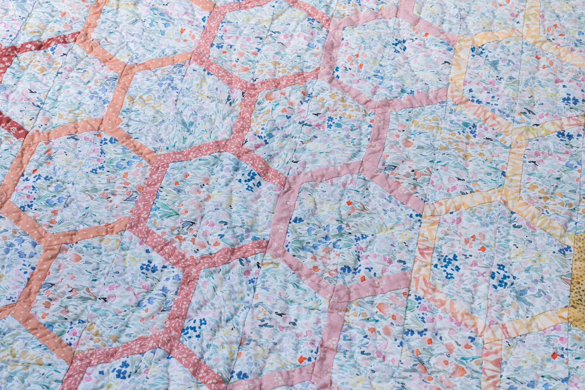 A unique quilt featuring a shimmering net of hexagons in a delicate gradient. Machine-pieced and hand-quilted by Mary Reedy in Port Townsend, WA. Three decades of fabric collection and quilting design have contributed to the inimitable effect of this cozy flannel-backed covering. With an appreciation for traditional American quilts, Mary brings an artist’s eye to this rich textile tradition. All fabrics are 100% cotton, with natural fiber fill.