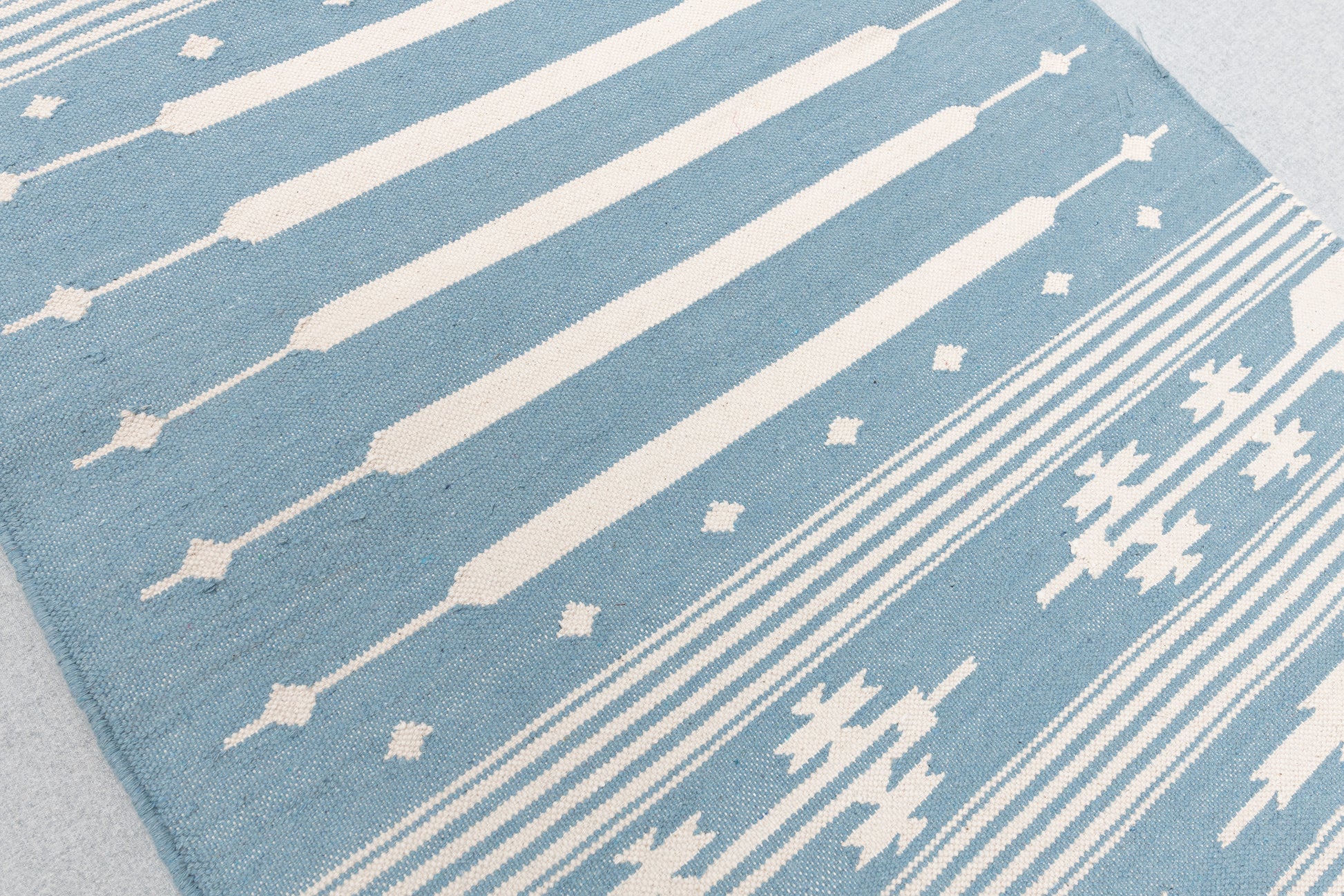 A sophisticated and contemporary take on a traditional dhurrie design. Handwoven by multi-generational weaver Dari Udhyog and his wife in Rajasthan, India. Showing both vertical and horizontal symmetry this rug uses repetition and nuance, balancing large graphic elements with small details. The densely woven structure of the rug is at once robust and welcoming. Use as a floor covering or wall hanging.