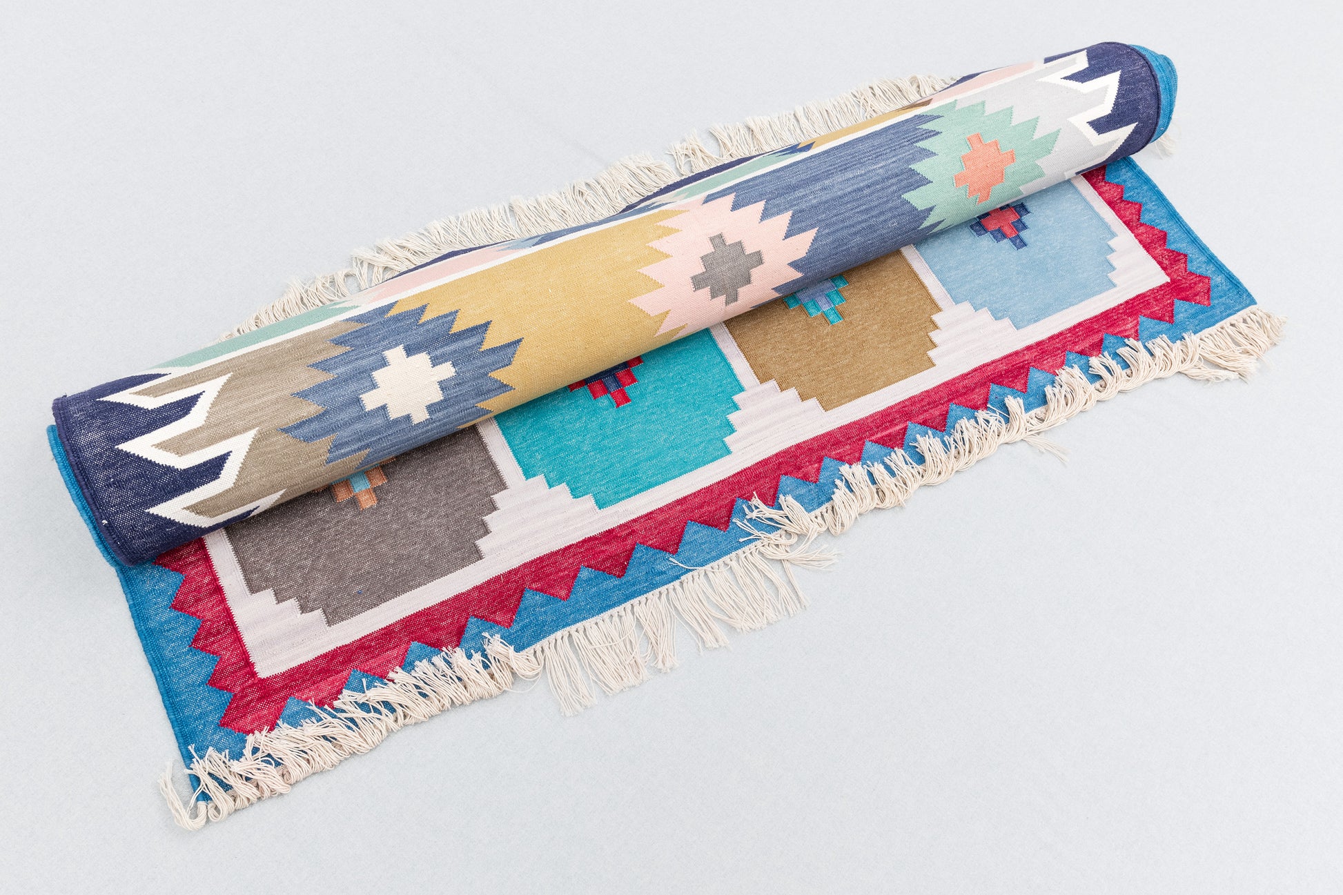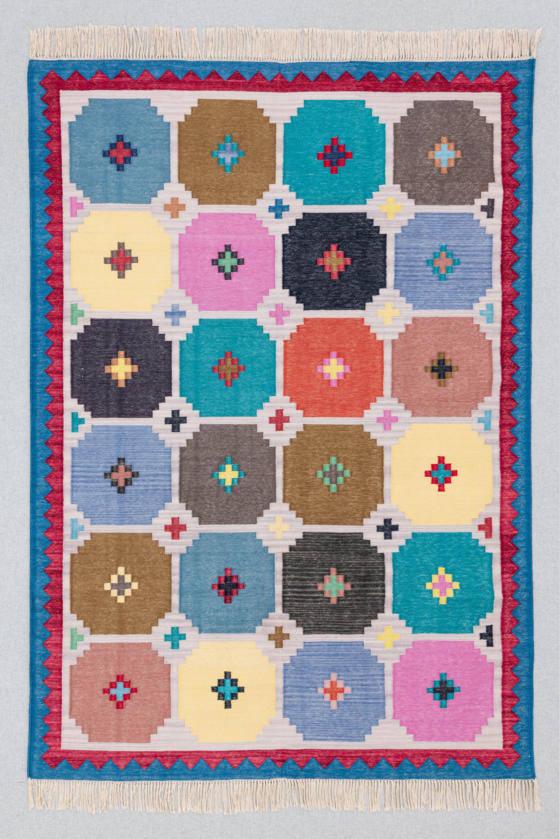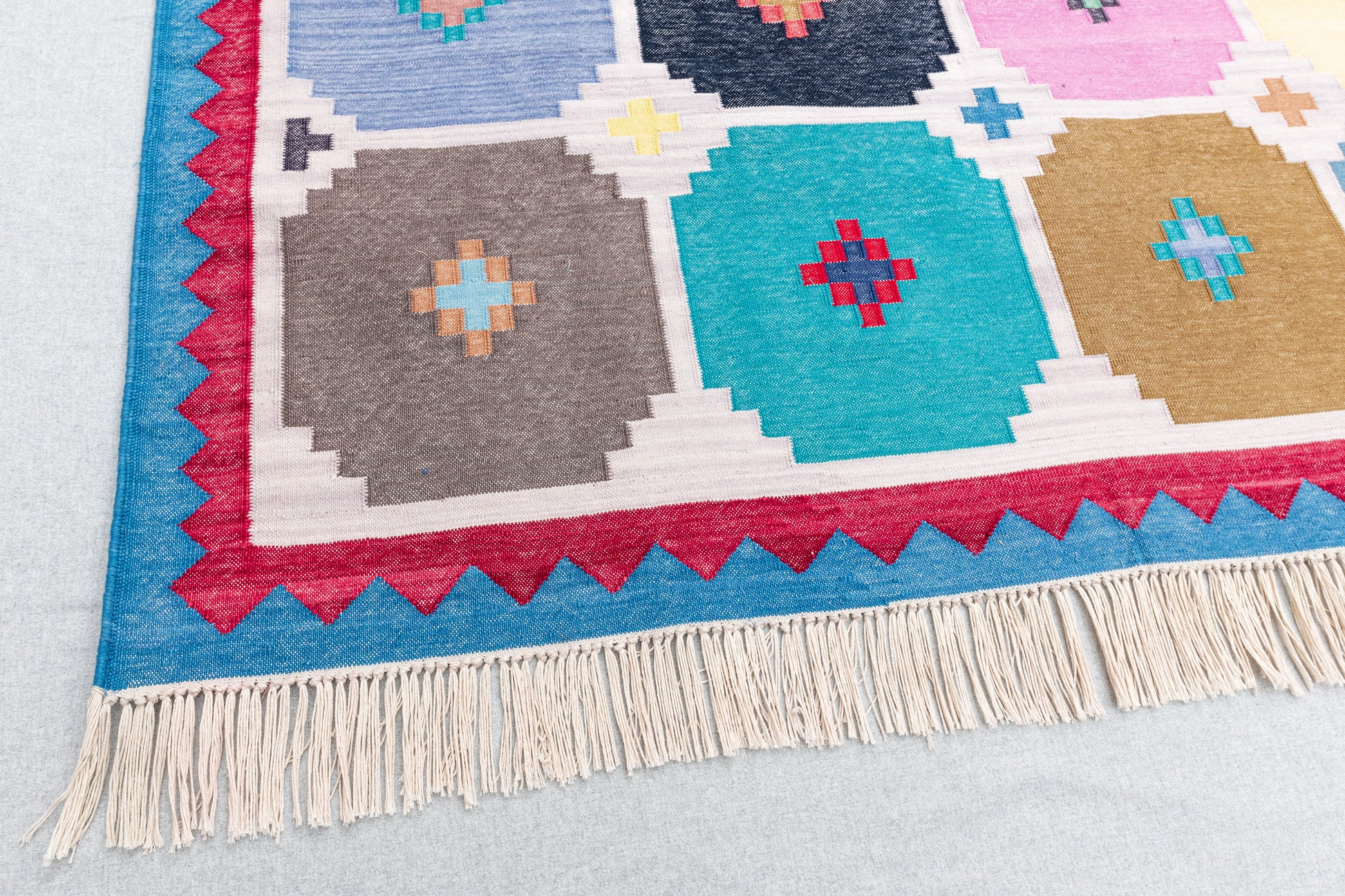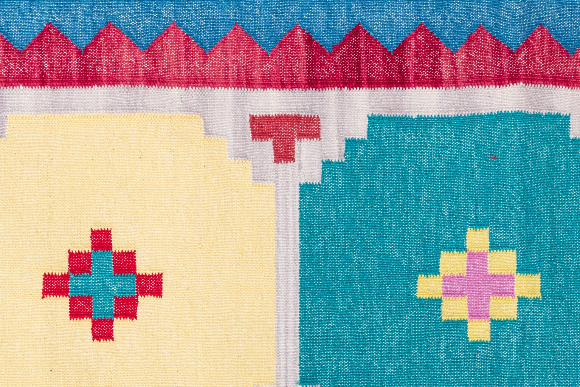 An optically generous dhurrie handwoven by multi-generational weaver Dari Udhyog and his wife in Rajasthan, India. Cells of yellow and pink, brown and teal and black jostle within the vibrant, blue and red zig-zag border. The densely woven structure of the rug is at once robust and welcoming and the idiosyncratic color choices and geometric forms will bring visual interest for years to come. Use as a floor covering or wall hanging.