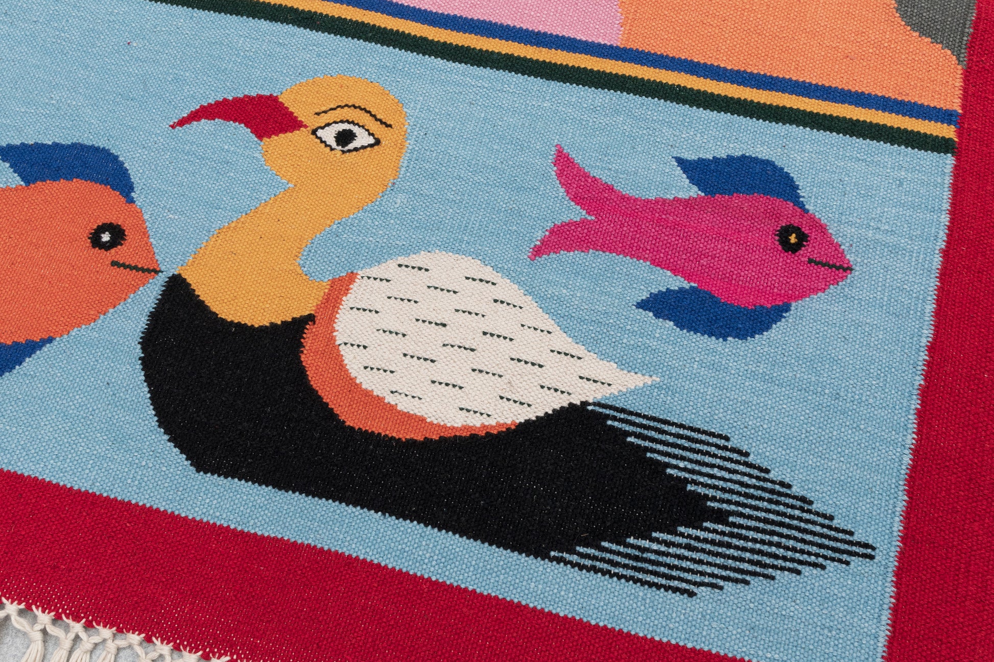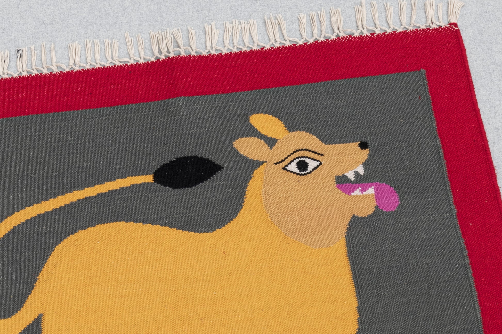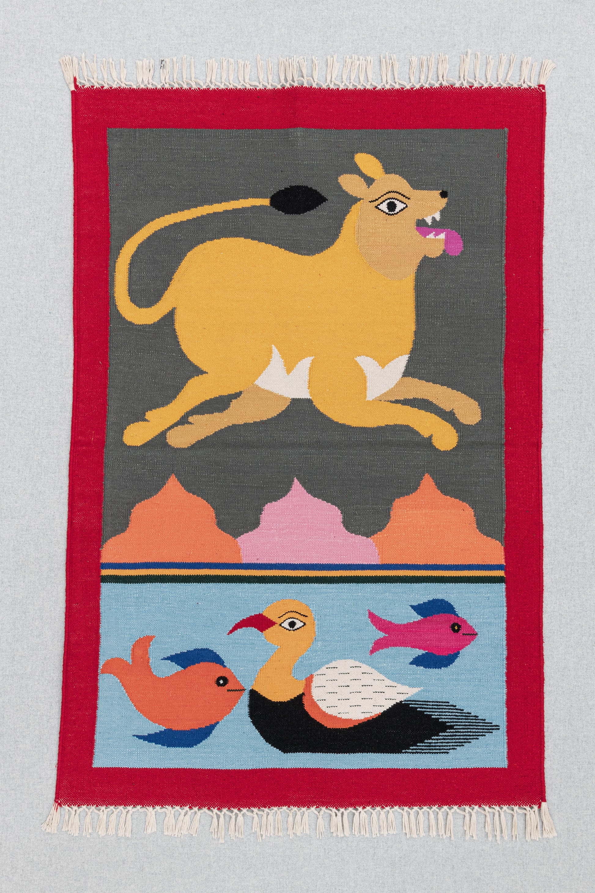 A poetically observant dhurrie handwoven by multi-generational weaver Dari Udhyog and his wife in Rajasthan, India. Imaginatively composed, a courageous lioness is suspended over pink and orange surrealist mountains. The pleasing and unusual color choices and charming animals will delight for years to come. The densely woven structure of the rug is at once robust and welcoming. Use as a floor covering or wall hanging.