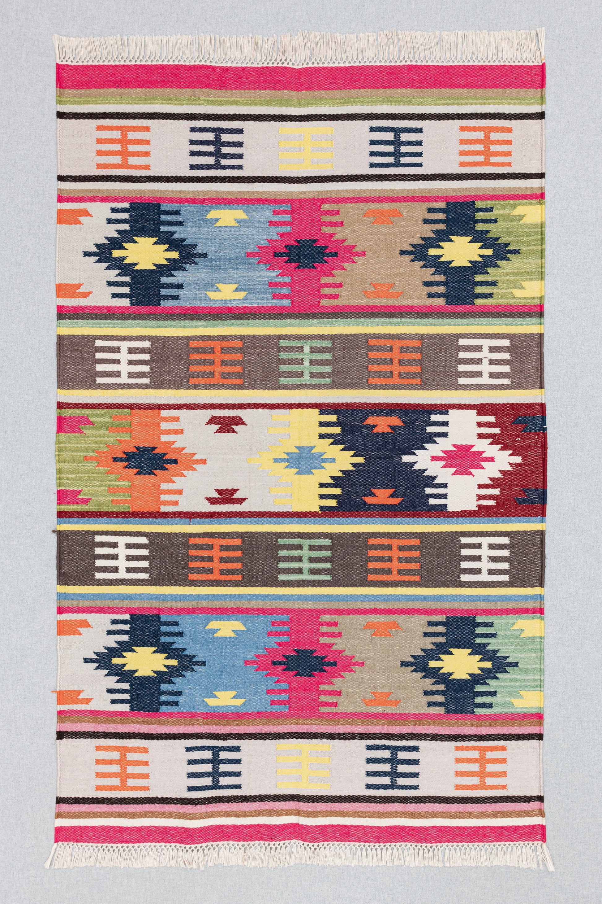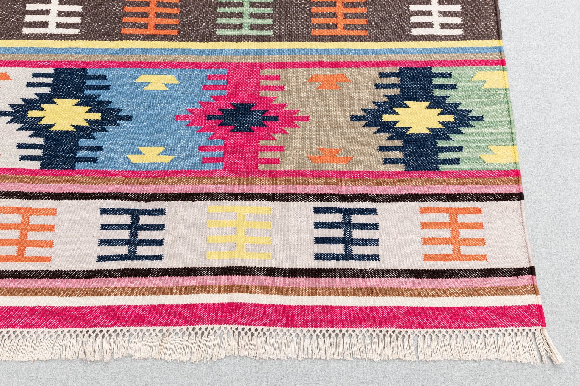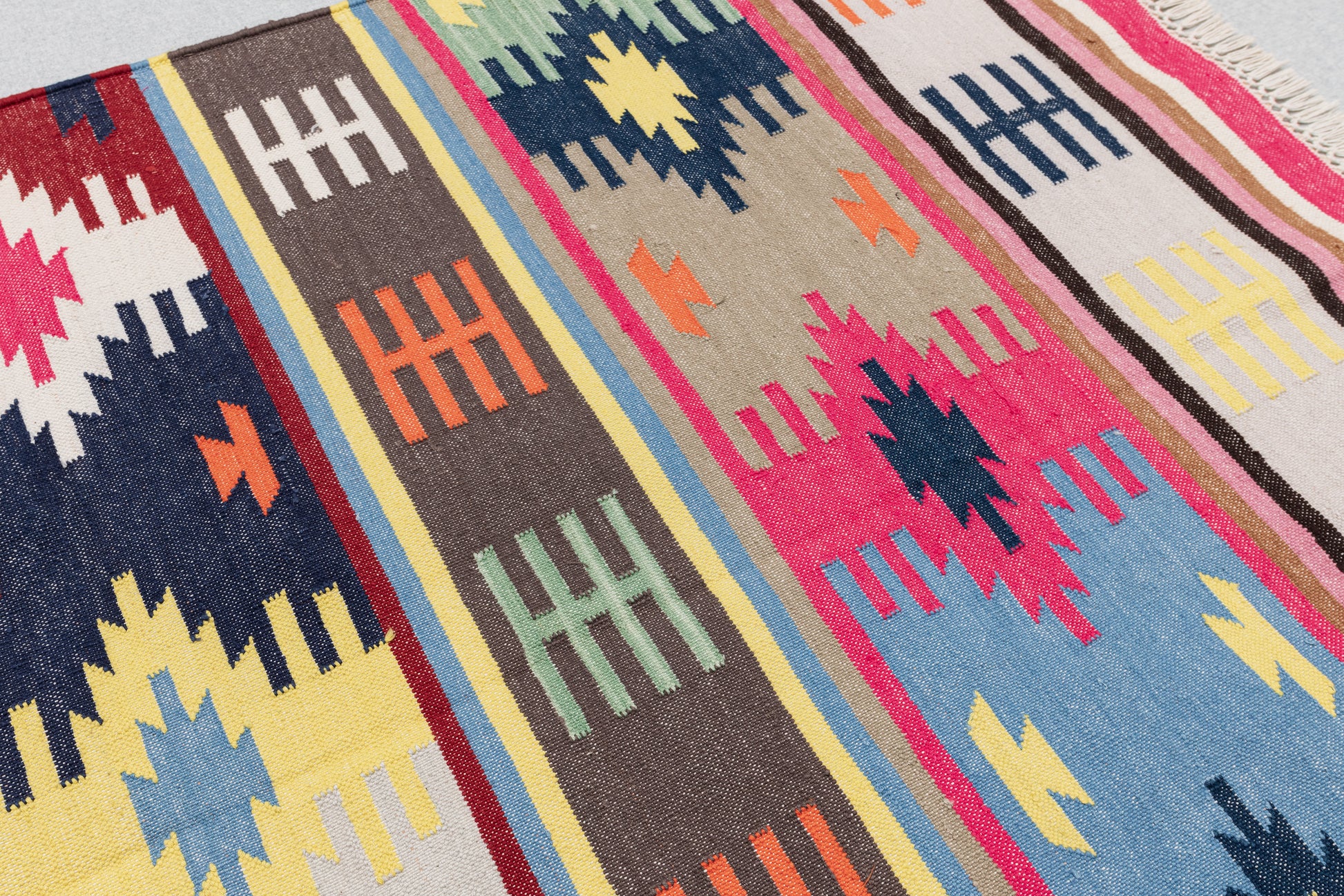 An optically generous dhurrie handwoven by multi-generational weaver Dari Udhyog and his wife in Rajasthan, India. The asymmetrical use of color adds dynamism to the repeating geometric forms in this pleasantly-sized rug. The densely woven structure of the rug is at once robust and welcoming. Use as a floor covering or wall hanging.