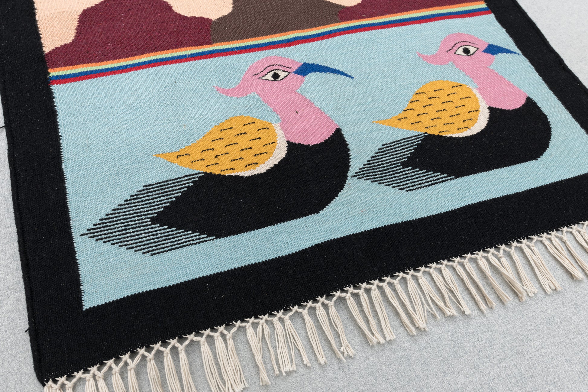 A poetically observant dhurrie handwoven by multi-generational weaver Dari Udhyog and his wife in Rajasthan, India. Imaginatively composed, a bird with blue feet flies over russet surrealist mountains and a pine tree hovers in the sky while two pink headed birds swim by below. The pleasing and unusual color choices and charming animals will delight for years to come. The densely woven structure of the rug is at once robust and welcoming. Use as a floor covering or wall hanging.